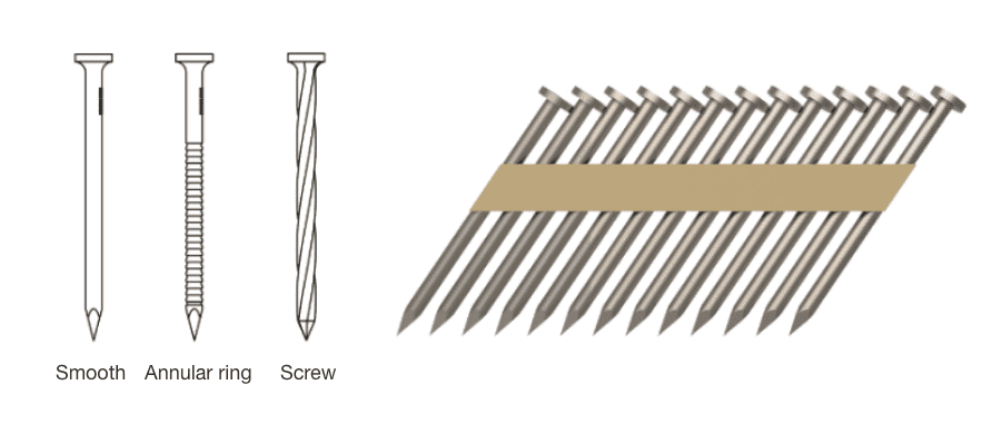 Paper collated nails are designed to fit all 28°to 34° pneumatic nailer tools. We use high performance and rigid paper tape as collation material to ensure they don't fall apart in hot, colt or wet weather. Compared with plastic collated nails and wire collated nails , these paper strip nails are more expensive but safer and cleaner during the driving operation. When the gun is fired, tiny pieces of paper are driven into the wood along with the nails rather than flying around the jobsite or hurting to the users. In addition, there will be less jams and wear when the nailer fired. These quality nails are ideally used to fasten lumber to any type of concrete or masonry work.