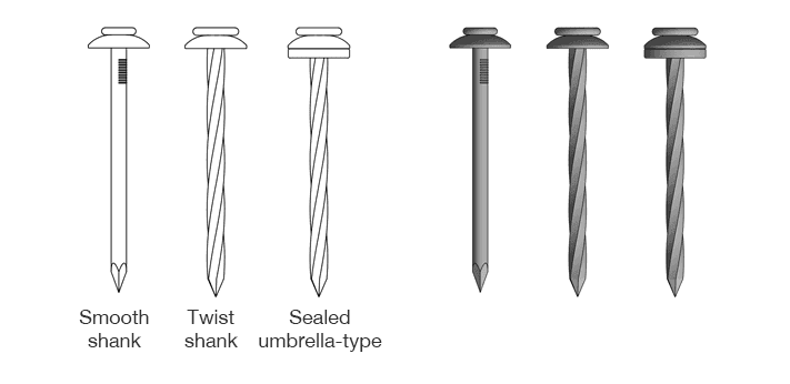 installation. These nails, with smooth or twist shanks and umbrella head, are the mostly used type of nails with less cost and good property. Umbrella head is designed for preventing the roofing sheets from tearing off around the head of the nail, as well as offering an artistic and decorative effect. The twist shanks and sharp points can hold wood and roofing tiles in position without slipping. We adopt Q195, Q235 carbon steel, 304/316 stainless steel, copper or aluminum as material, so as to ensure the nails resistant to extreme weather and corrosion. Besides, rubber or plastic washers are available to prevent water leaking.